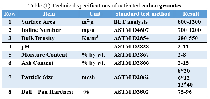 جدول (1) مشخصات فنی کربن فعال (اکتیو) گرانول
