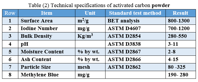 جدول (2) مشخصات فنی کربن فعال (اکتیو) پودری