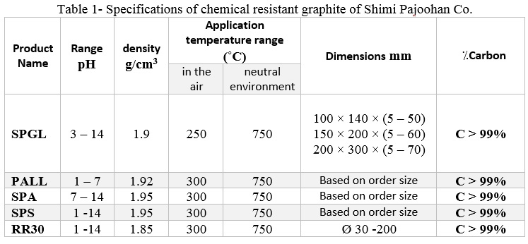 • جدول 1- مشخصات گرافیت‏های مقاوم به مواد شیمیائی شرکت شیمی پژوهان